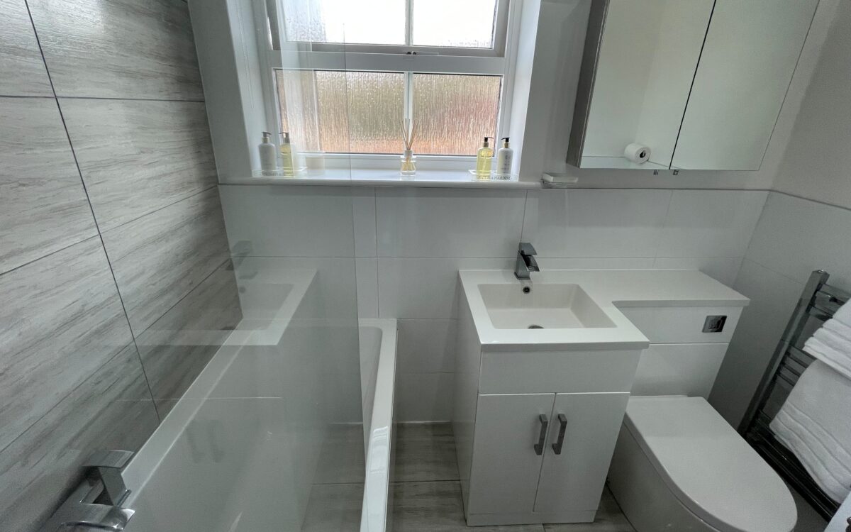 BATHROOM: roller blind, refitted, panelled bath with shower over, tiled splash & screen, part tiled walls, vanity unit with washbasin & WC, extractor fan, stainless steel towel radiator, mirrored medicine cabinet and uPVC double glazed window.
