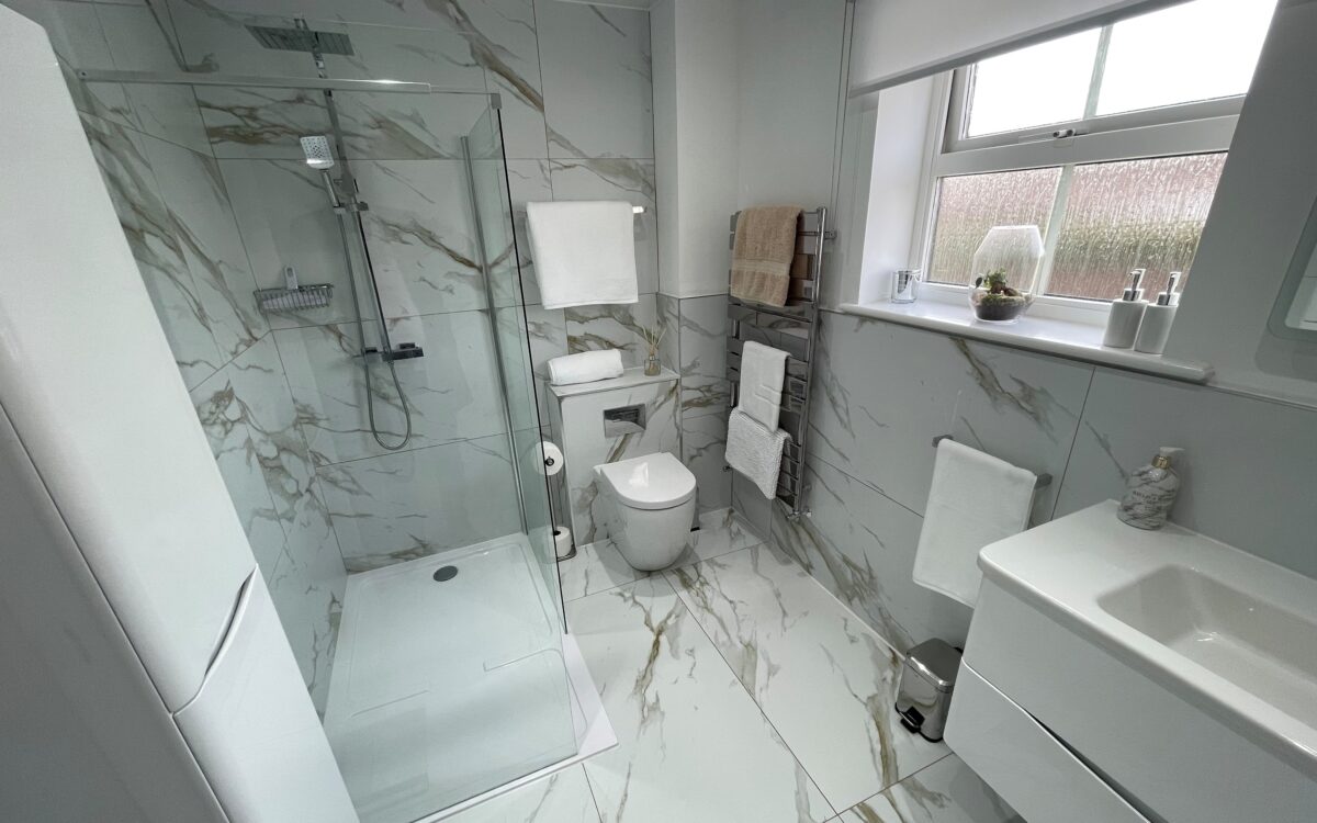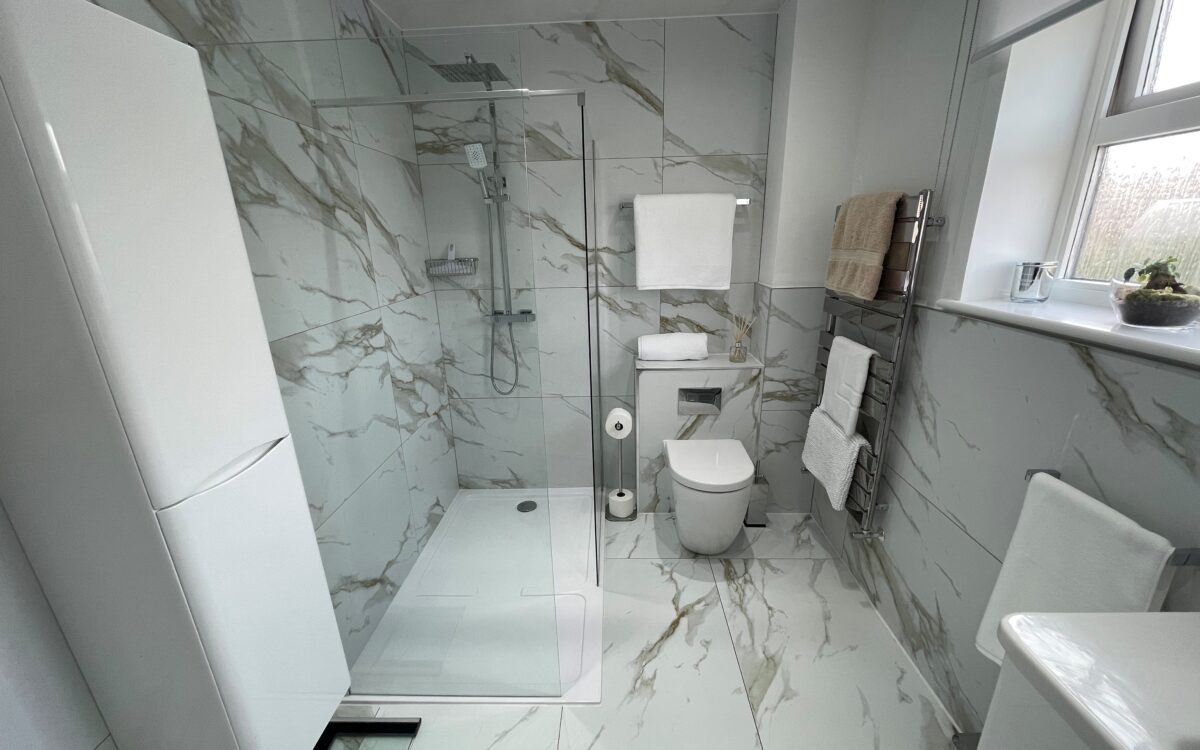 EN-SUITE SHOWER ROOM: refitted, 10’ 0” x 6’ 6” (3.05m x 1.98m), large tiled shower enclosure, upright stainless steel towel radiator, vanity unit with washbasin, wall hung cupboard, uPVC double glazed window with roller blind, back to wall WC, tiled floor, part tiled walls, extractor fan and PVC ceiling incorporating 6 concealed down lighters.