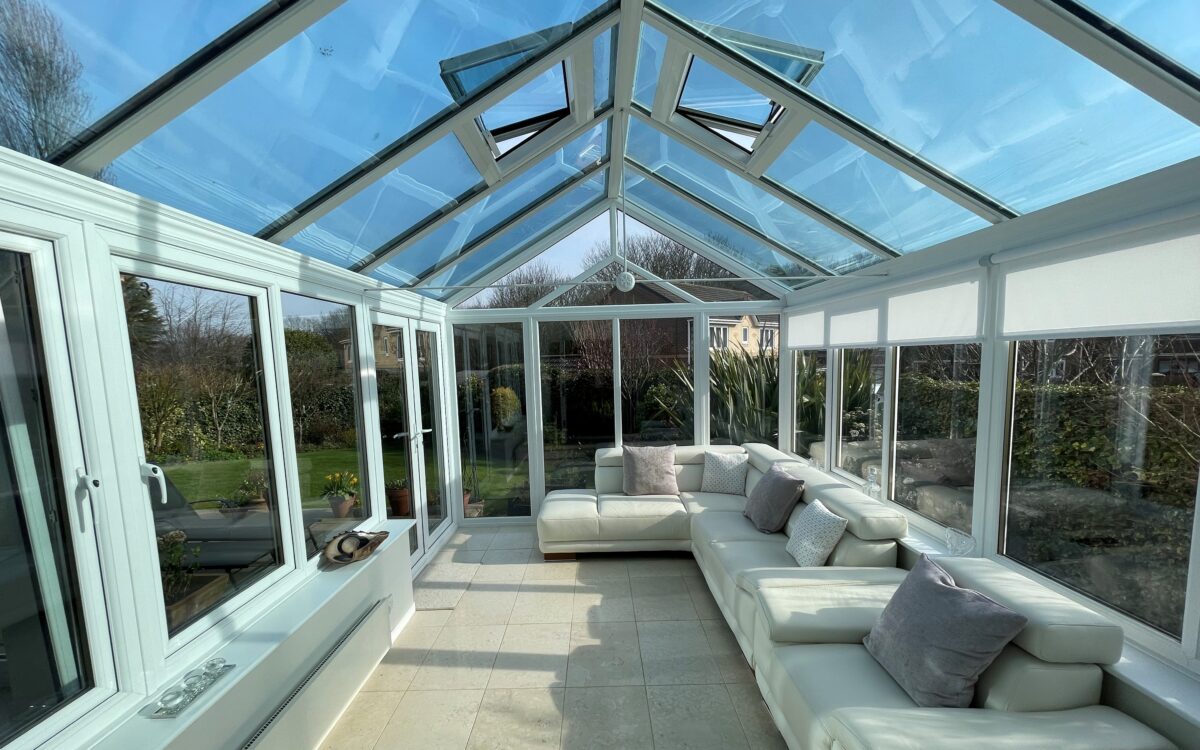 CONSERVATORY: 16’ 0” x 9’ 8” (4.88m x 2.95m), roller blind, uPVC double glazed, limestone tiled floor, power, 2 fitted wall lights, 2 electric roof windows, electric heater and double opening doors leading to rear garden.