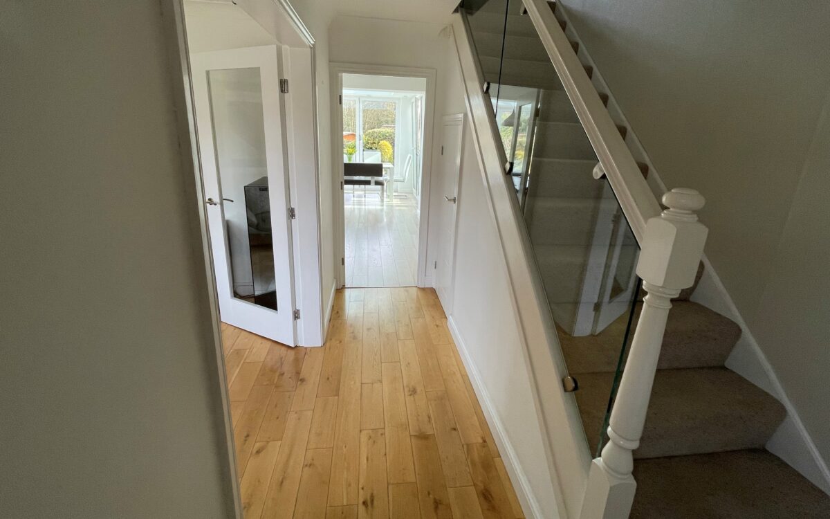 HALL: roman blind, cloaks cupboard, roller blind, double banked radiator, uPVC double glazed window, oak flooring, timber & glass feature staircase to the first floor and understairs store cupboard.
