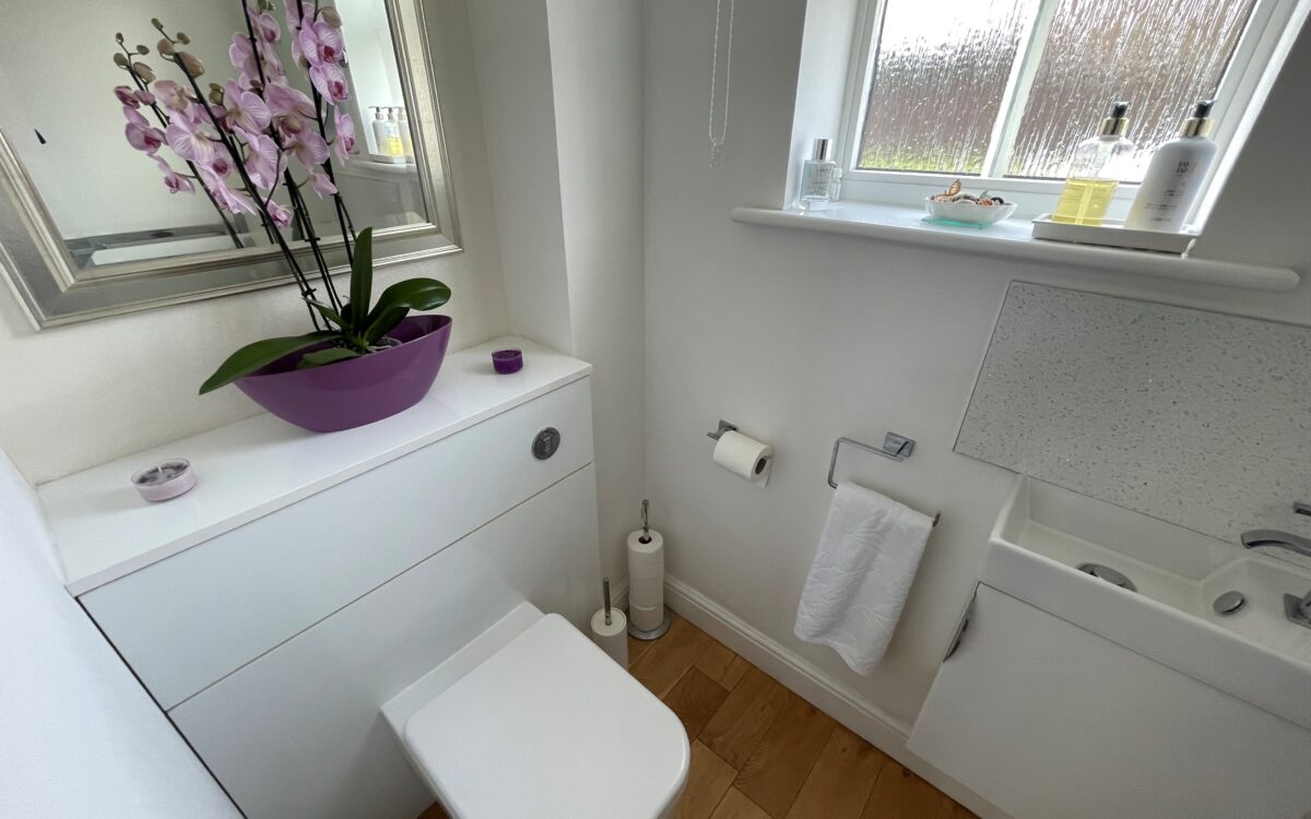 DOWNSTAIRS WC: refitted, uPVC double glazed window, vanity unit with washbasin, low level WC and upright stainless steel towel radiator.