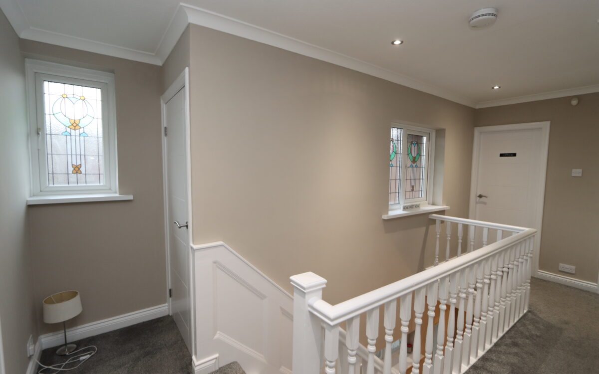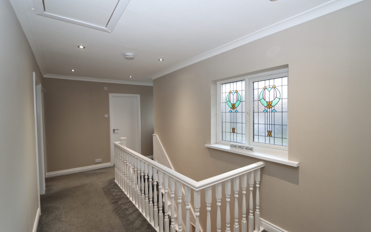 LANDING: spacious area, 16’ 8” x 7’ 7” (5.08m x 2.31m – maximum overall measurement), 2 uPVC double glazed windows with feature leaded & stained glass, concealed down lighters, access to loft space and fitted store cupboard housing ‘Baxi’ gas fired combination boiler (installed 2020).