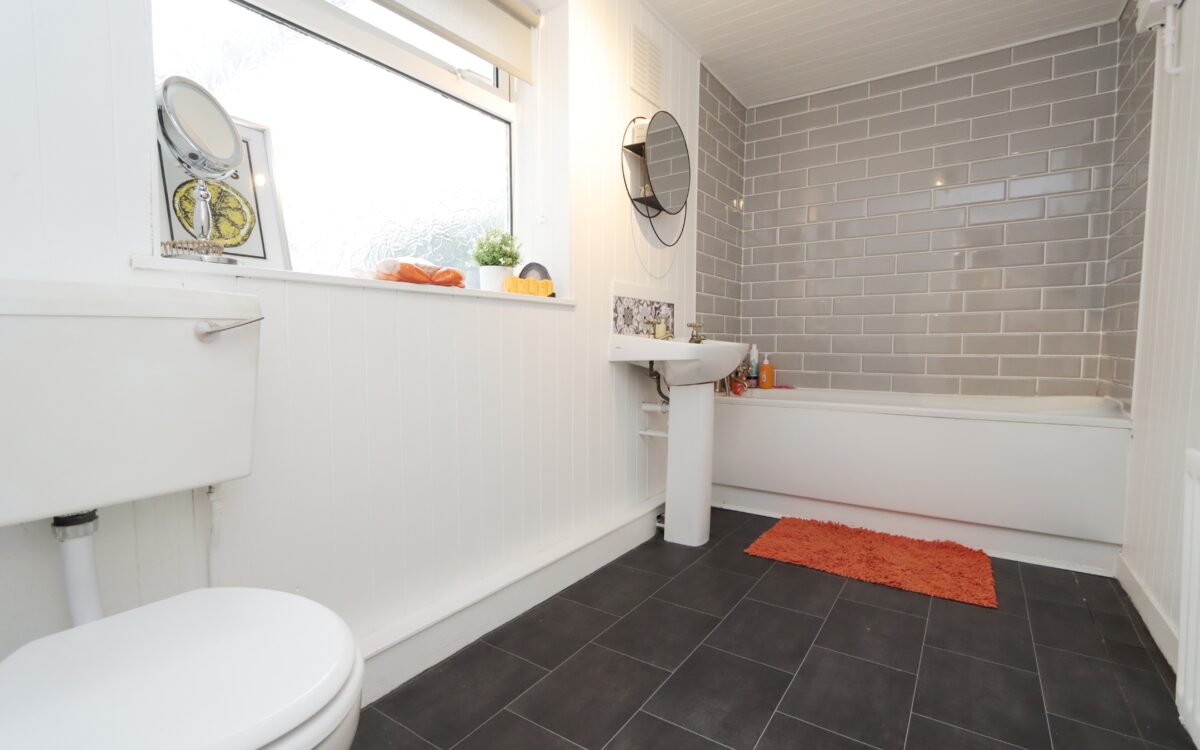 BATHROOM: 11’ 1” x 5’ 4” (3.38m x 1.63m), uPVC double glazed window with roller blind, double banked radiator, low level WC, pedestal washbasin and panelled bath with tiled splashback.