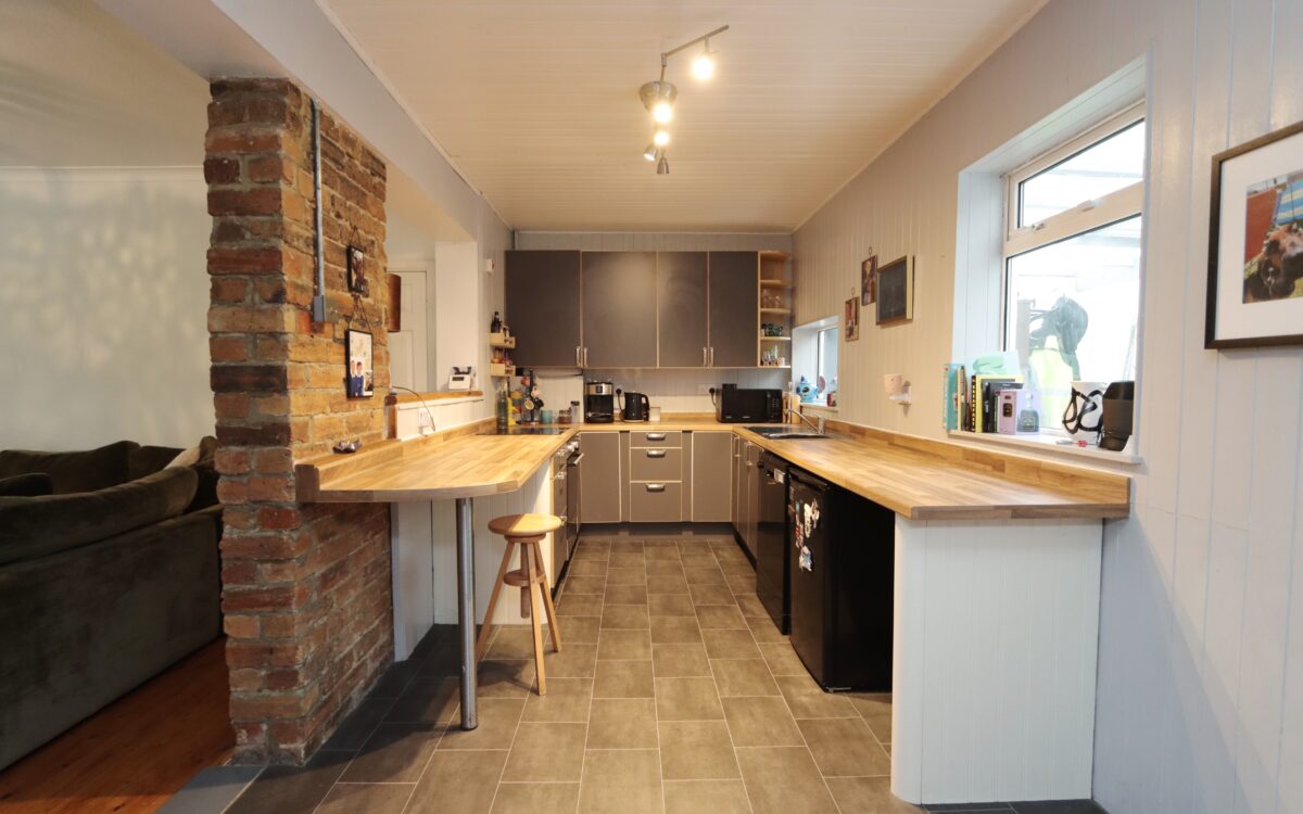 BREAKFASTING KITCHEN: 17’ 2” x 7’ 9” (5.23m x 2.36m), worktops with upstands, part panelled walls, fitted wall & floor units, ‘Hisense’ electric hob, ‘Hotpoint’ oven, stainless steel sink with drainer & matching mixer tap, fitted breakfast bar, 2 uPVC double glazed windows, cupboard housing ‘Baxi’ gas fired combination boiler, brick recess and door to rear lobby.