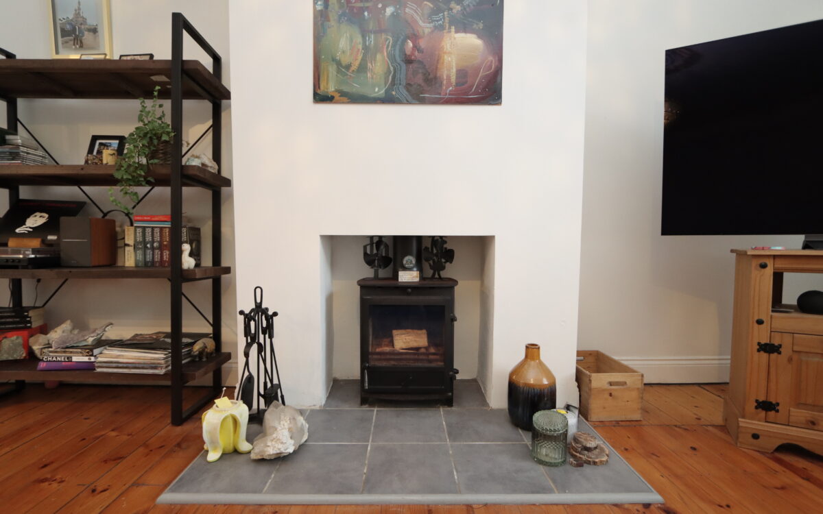 LOUNGE: at front, 16’ 2” x 15’ 5” (4.93m x 4.70m), 2 radiators, uPVC double glazed window with garden aspect & venetian blind, fireplace housing log burner with tiled hearth, opening to kitchen and fitted understairs storage cupboard.
