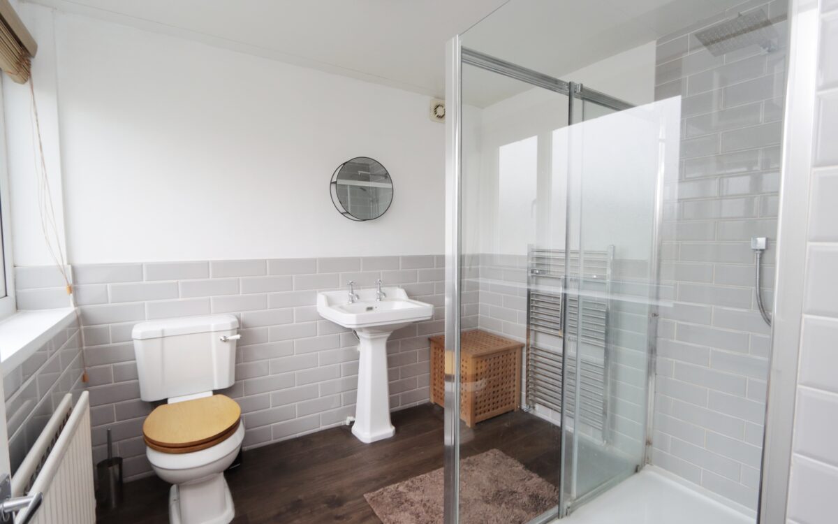 SHOWER ROOM: 8’ 5” x 7’ 9” (2.57m x 2.36m), ½ tiled walls, low level WC, large tiled walk-in shower enclosure with rain head shower, uPVC double glazed window with venetian blind, stainless steel upright towel radiator and double banked radiator.