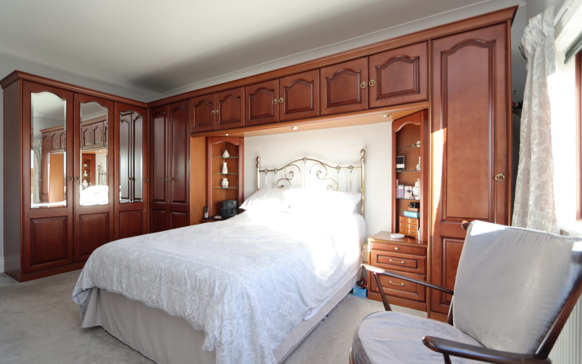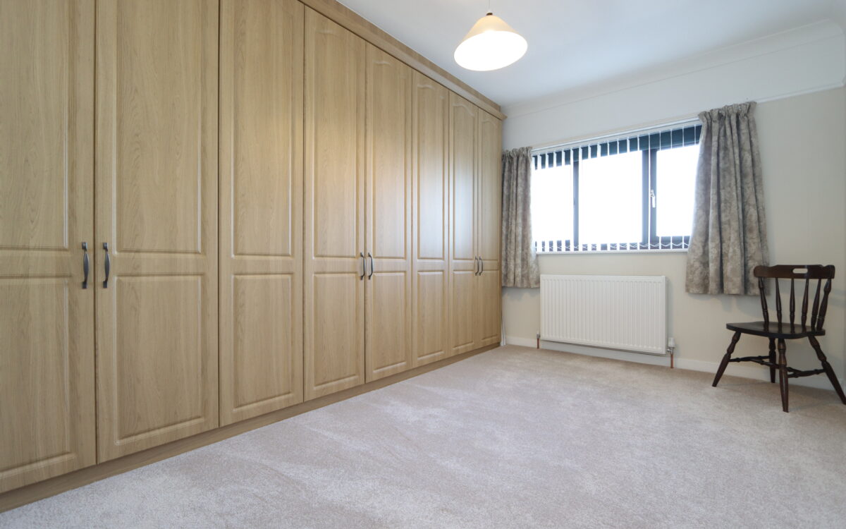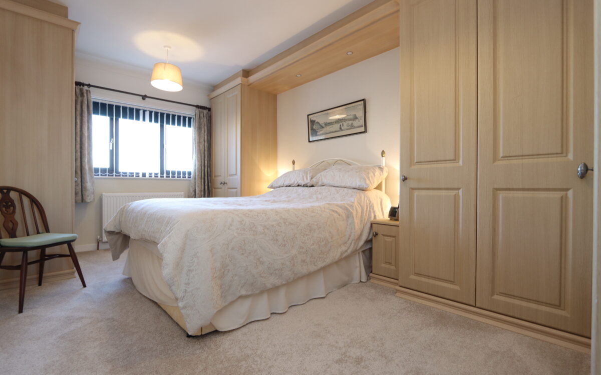 No. 1: at rear, 16’ 0” x 9’ 11” (4.88m x 3.02m), radiator, fitted bedroom furniture on 2 walls including bedside drawers, wardrobes, cupboards, shelved display and 3 spotlights, 2 fitted wall lights, door to ensuite and uPVC double glazed window with splendid open countryside views.