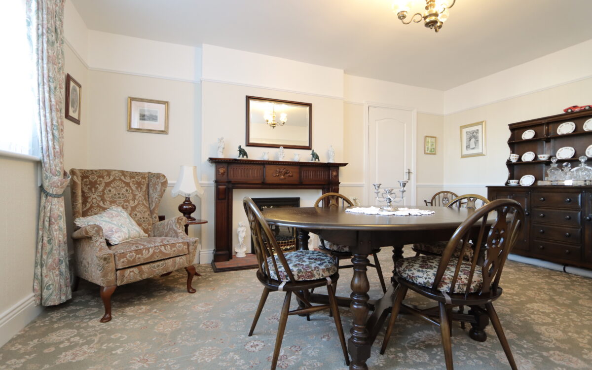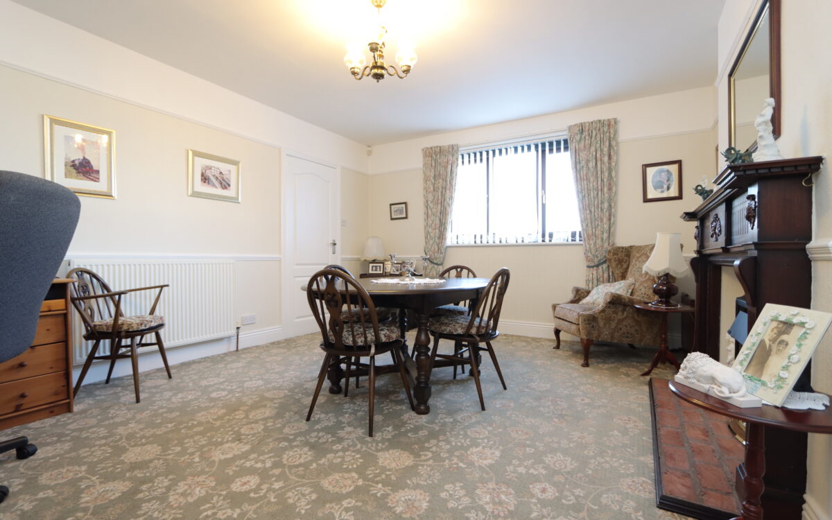 DINING ROOM: at front, 16’ 3” x 12’ 7” (4.95m x 3.84m), radiator, uPVC double glazed window with vertical louvred blinds, dado rail, picture rail, door to utility room and traditional style feature fireplace with wood surround and brick hearth incorporating electric fire.