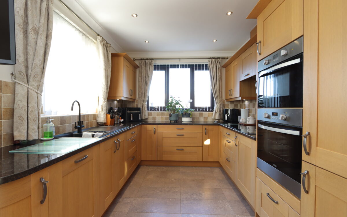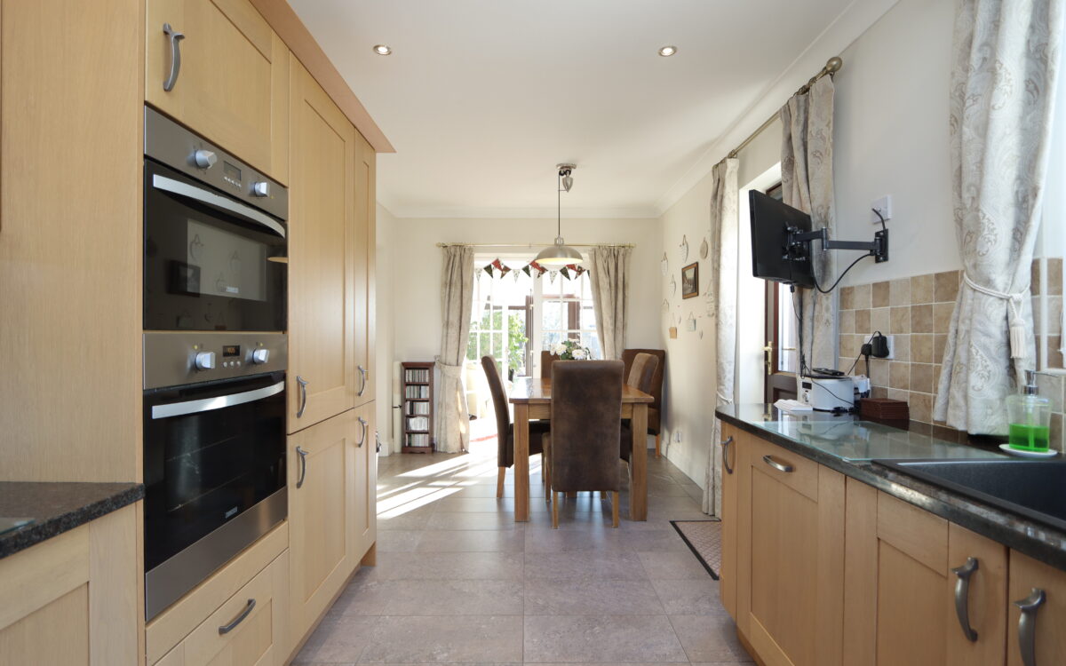 DINING KITCHEN: 20’ 5” x 8’ 10” (6.22m x 2.69m), tiled floor, a good range of fitted wall & floor units, ‘Zanussi’ eye level oven & microwave, ‘Whirlpool’ induction hob with illuminated extractor hood above, illuminated work surfaces, part tiled walls, integrated ‘Zanussi’ fridge/freezer, larder cupboard, 1 ½ bowl sink with drainer & matching mixer tap, integrated ‘Hotpoint’ dishwasher, radiator, uPVC double glazed door to side, 2 uPVC double glazed windows with vertical louvred blinds, 8 concealed down lighters and glazed Georgian style doors to sun lounge.
