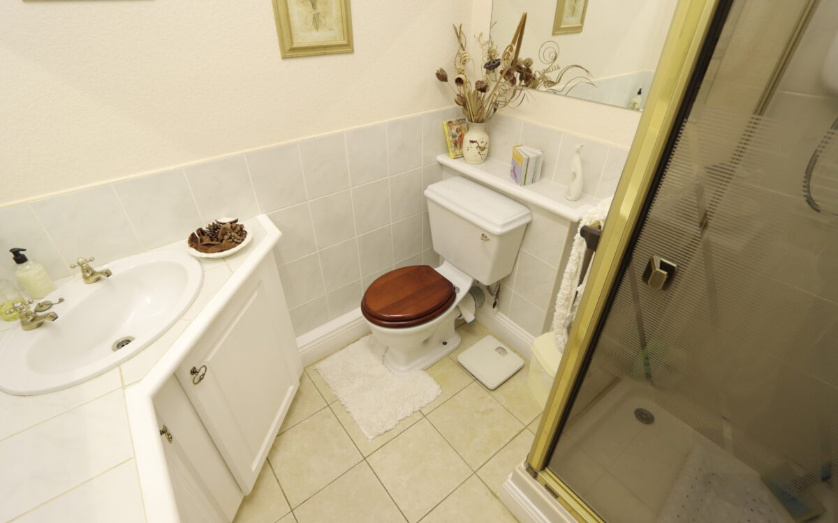 SHOWER ROOM: tiled floor, part tiled walls, low level WC, vanity unit with washbasin, extractor fan, upright towel radiator and corner tiled shower cubicle.