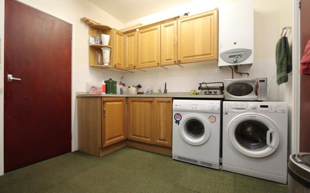 UTILITY ROOM: 9’ 4” x 9’ 0” (2.84m x 2.74m), fitted wall & floor units, stainless steel sink with hot & cold water supplies, plumbing for washing machine, ‘Main’ multi point hot water heater, part tiled walls and doors leading to workshop and storage room.