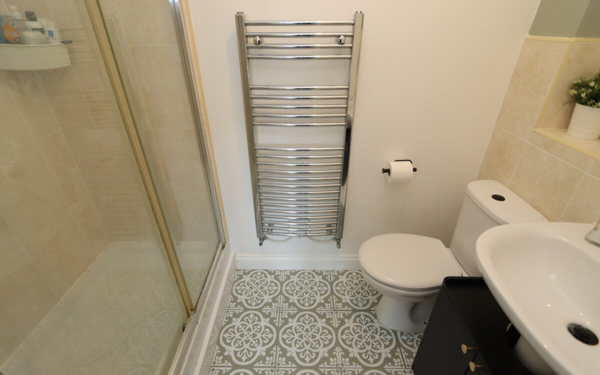 EN-SUITE SHOWER ROOM: tiled shower enclosure with rain head shower, stainless steel upright towel radiator, low level WC and pedestal washbasin.