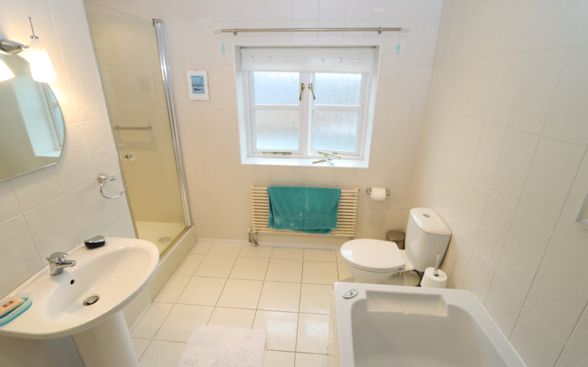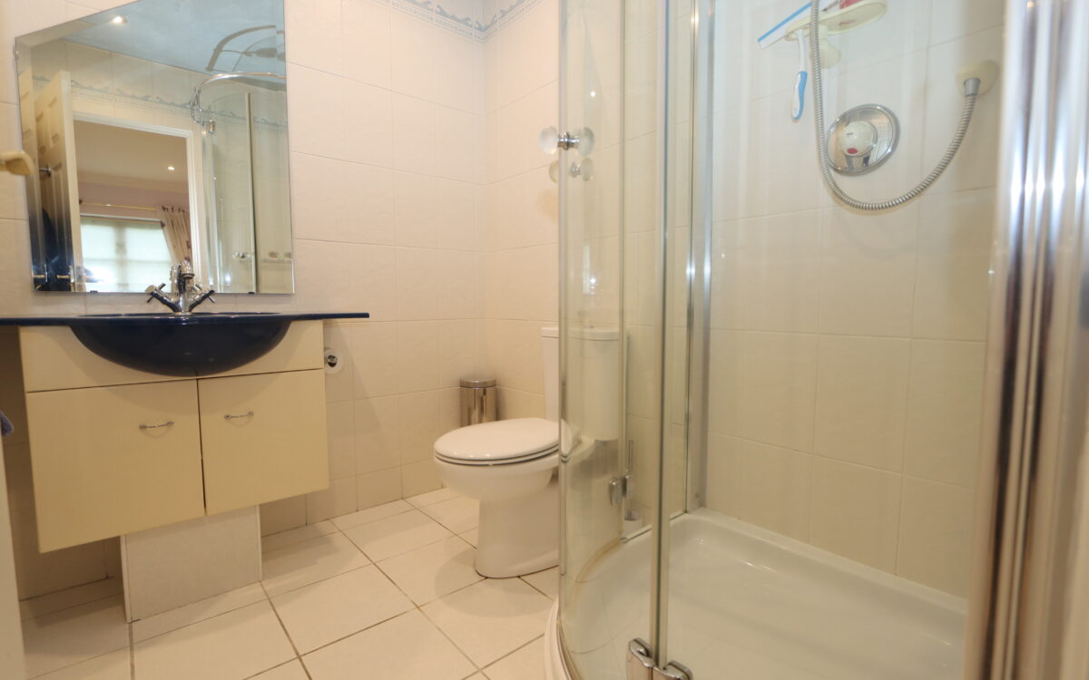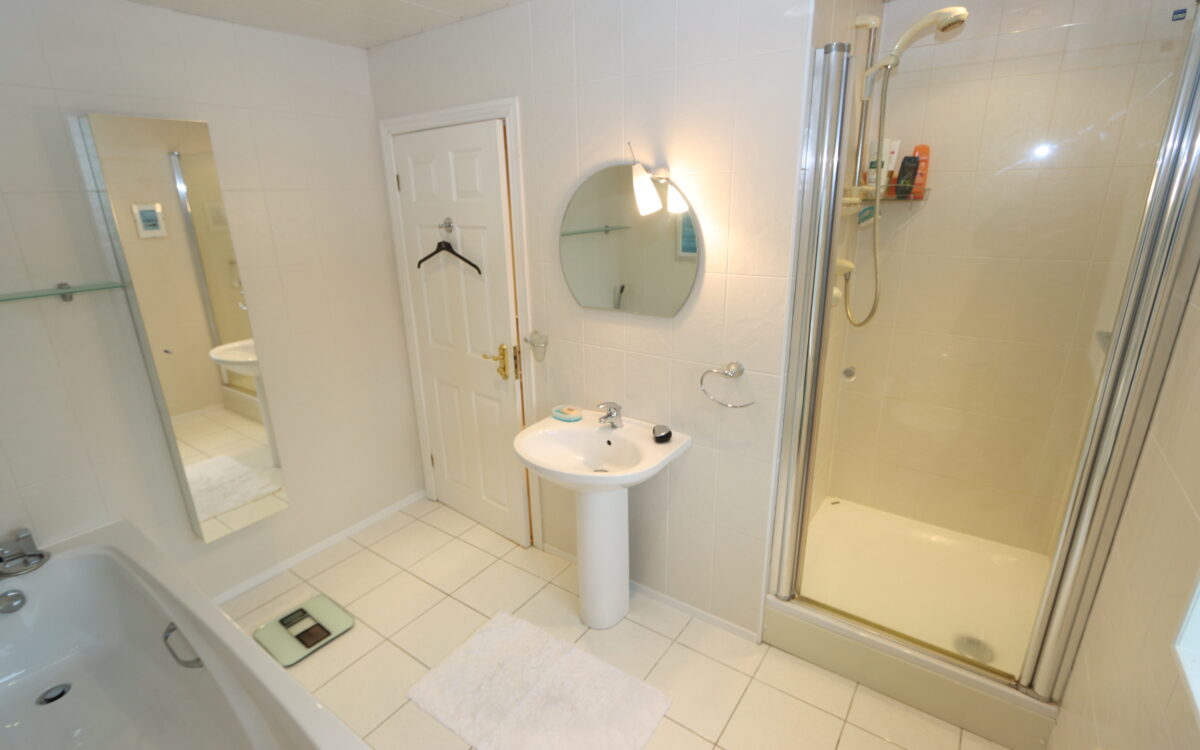 BATHROOM: 9’7″ x 6’10” (2.92m x 2.08m) plus tiled shower cubicle, panelled Jacuzzi bath, pedestal washbasin, low level WC, radiator, illuminated mirror, medicine cabinet with mirrored door, tiled heated floor, 5 concealed downlighters and double glazed sealed unit window.