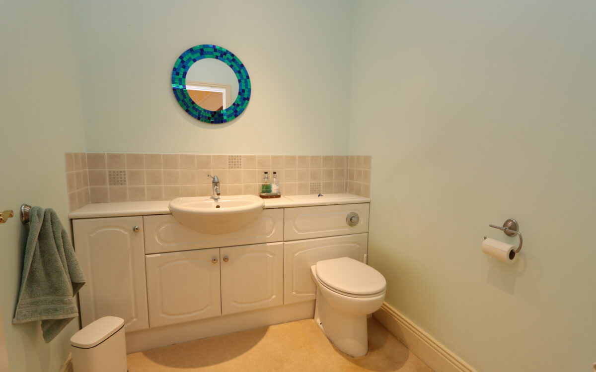 CLOAKROOM: 5’9″ X 6’1″ (1.75m x 1.85m) with vanity unit, low level WC, extractor fan, double banked radiator and 2 concealed downlighters.