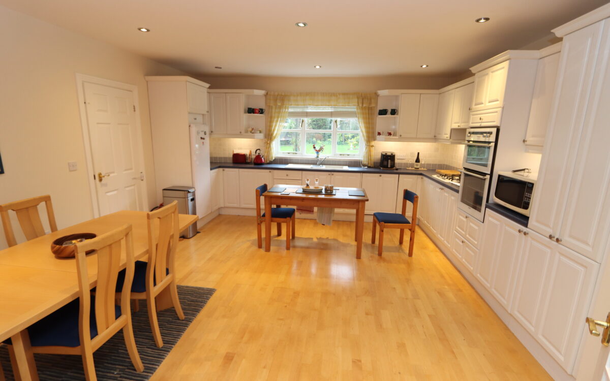 SPACIOUS DINING KITCHEN: 15’2″ X 17’3″ (4.62m x 5.26m) with fitted wall and floor units, partially tiled walls, double banked radiator, ‘Stoves’ eye-level oven, ‘Stoves’ gas hob with illuminated extractor hood, integrated dishwasher, integrated freezer, ‘Beko’ fridge, 9 concealed downlighters and double glazed sealed unit window.