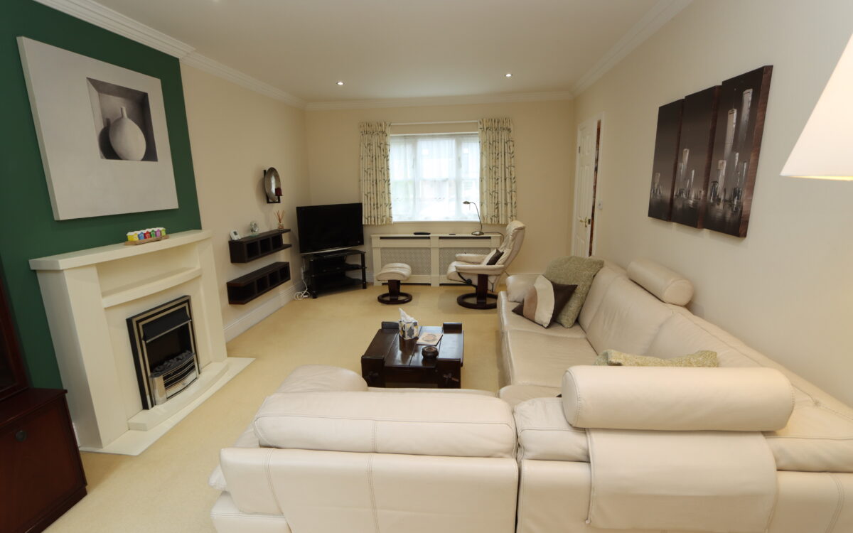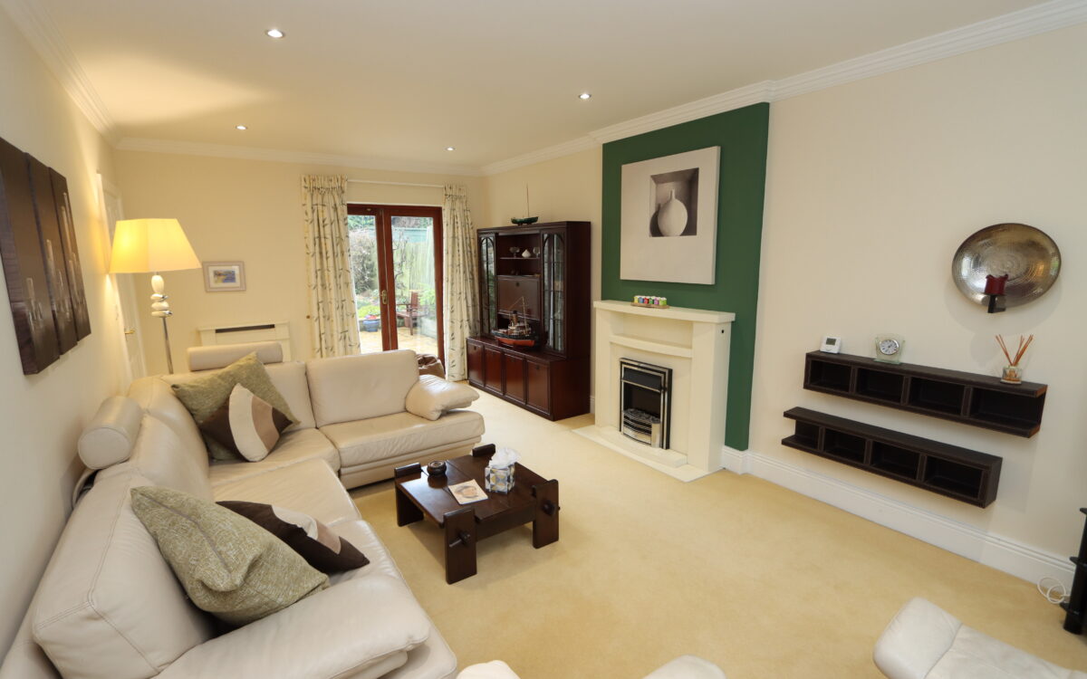THROUGH LOUNGE: 11’6″ X 20’4″ (3.51m x 6.20m) fireplace with electric fire, 2 radiators with covers, 6 concealed downlighters, double glazed sealed unit window and double glazed sealed unit patio doors to rear garden.