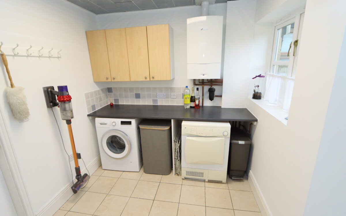 UTILITY ROOM: 7’5″ x 8’4″ (2.26m x 2.54m) with tiled floor, ‘Bosch’ washing machine, ‘Whirlpool’ tumble dryer, partially tiled walls, ‘Worcester’ combi-boiler (installed 2014), extractor fan and door to garage.