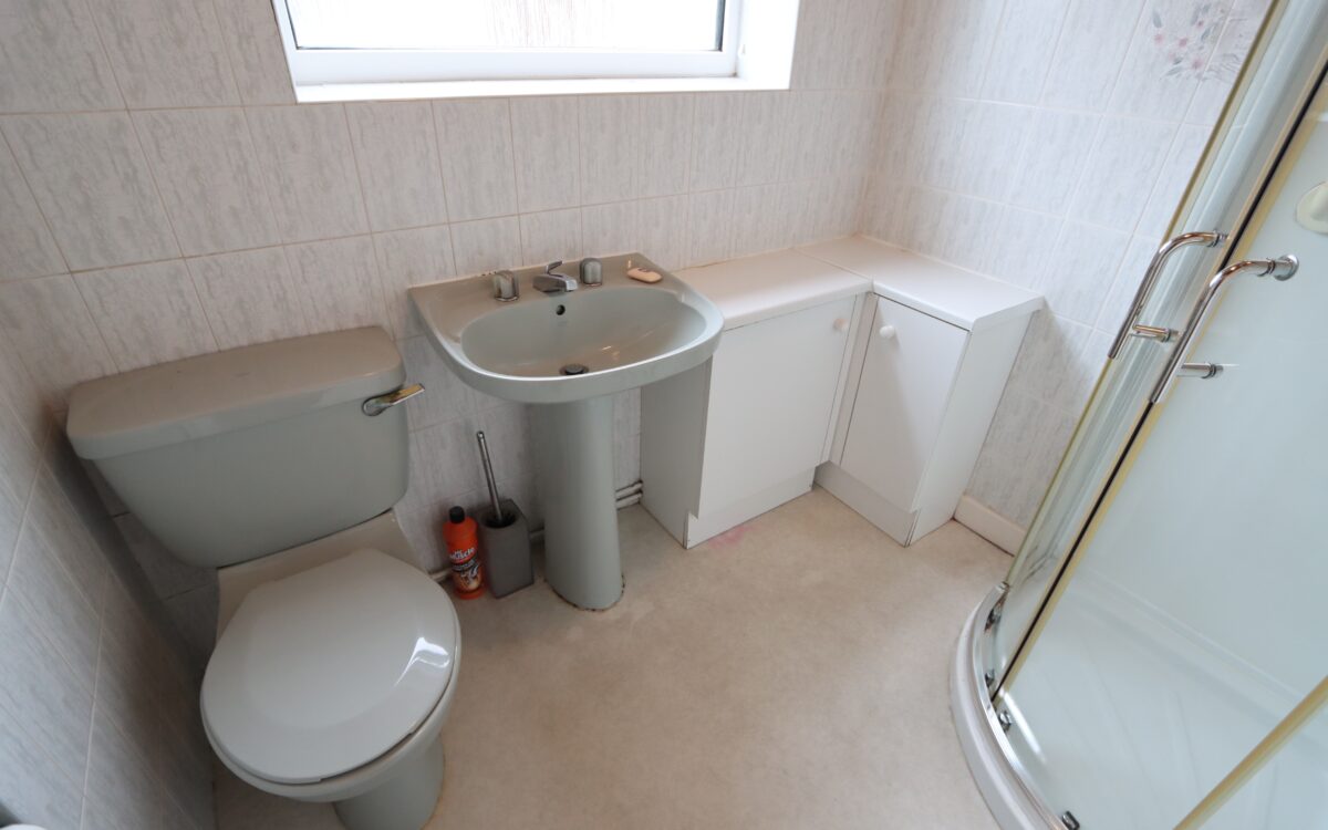 SHOWER ROOM pedestal washbasin, low-level WC, shower cubicle, radiator & uPVC double glazed window.