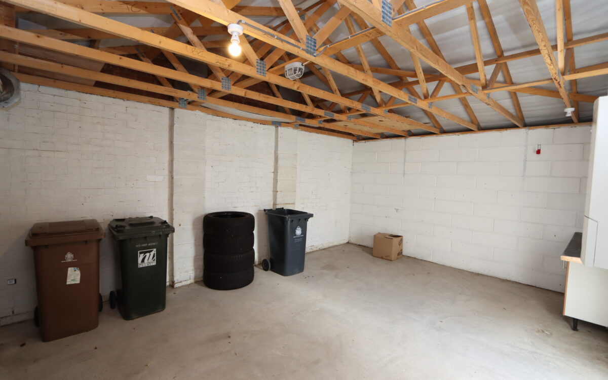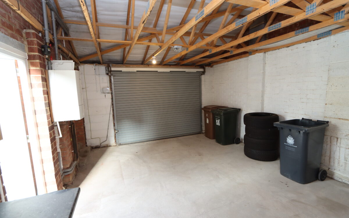 GARAGE 14’4″ x 18’9″ (4.37m x 5.71m) with storage in roof space, electric roll-over door, power & light, ‘Worcester’ combi boiler & uPVC double glazed door to rear garden.