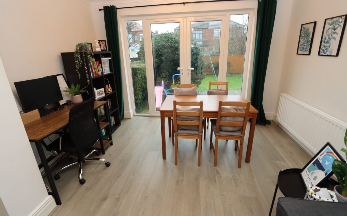 EXTENDED DINING ROOM: 11’7″ x 19’0″ (3.53m x 5.79m) with double banked radiator, recess for fireplace, uPVC double doors to rear garden, plus understairs meter/store cupboard.
