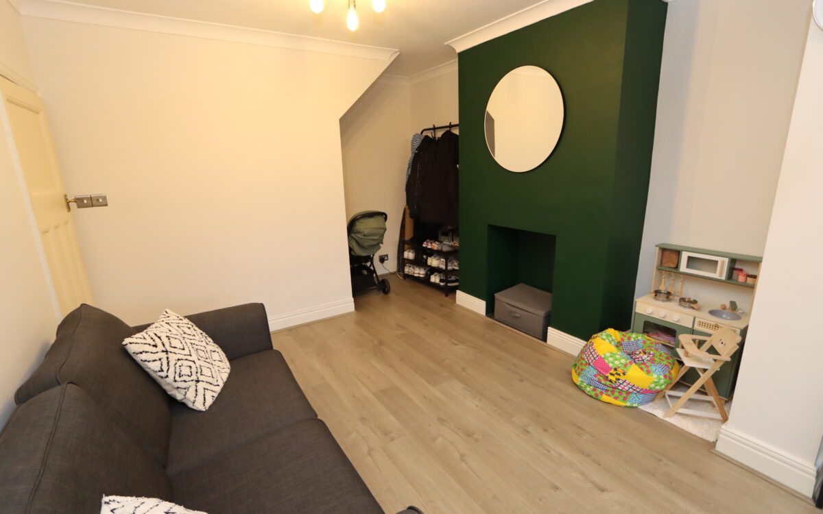 No. 1: at the front 14’7″ x 12’8″ (4.44m x 3.86m) including square uPVC double glazed bay window with venetian blinds & feature leaded & stained glass transoms, and double banked radiator.