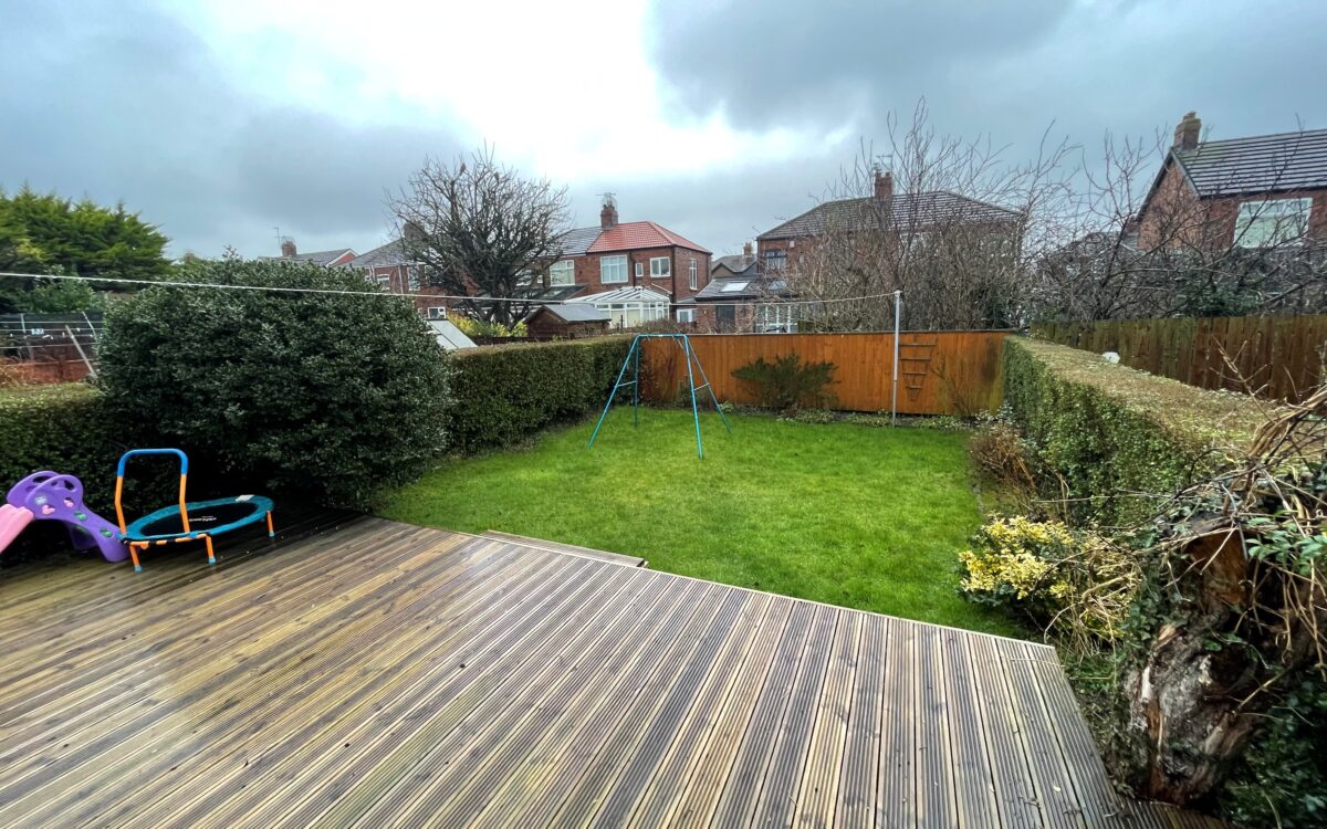 GARDENS: to the front there is a driving way providing car standage, lawn and borders. The rear garden measures approx. 35’8″ (10.87m) long with a raised decked area, tap, lawn and borders.