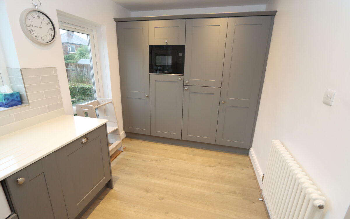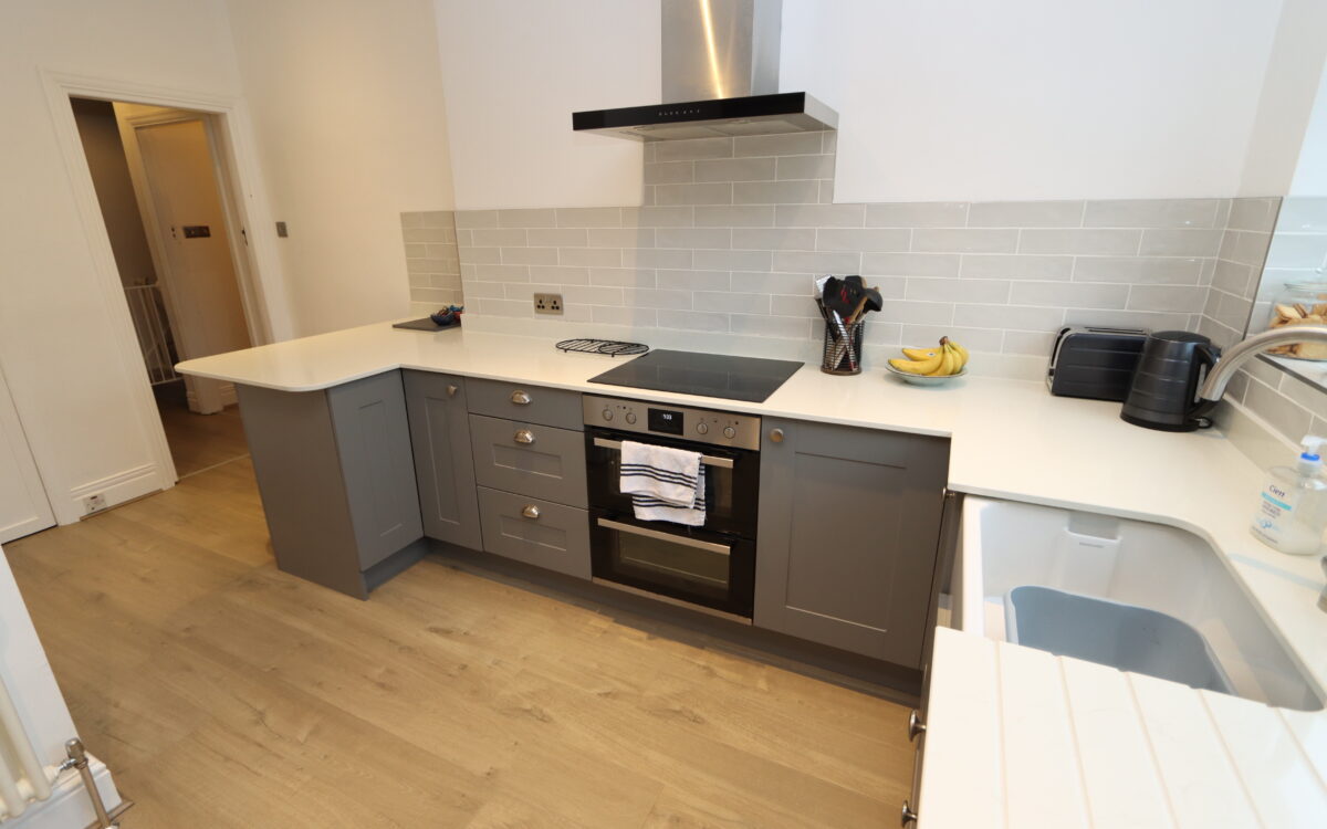 REFITTED AND EXTENDED BREAKFASTING KITCHEN: 14’0″ X 14’5″ (4.27m x 4.39m max overall ‘L’ shaped measurement), with radiator, fitted wall and floor units, Belfast sink, ‘Zanussi’ induction hob with extractor hood above, ‘Zanussi’ oven, ‘Zanussi’ microwave, integrated fridge freezer, integrated ‘AEG’ dishwasher, fitted store cupboard, partially tiled walls, 8 concealed downlighters, uPVC double glazed window and double glazed door to rear garden.