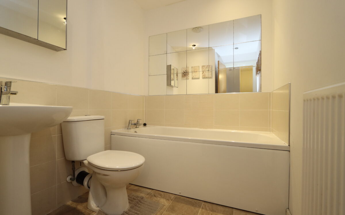 BATHROOM: part-tiled walls, panelled bath, pedestal washbasin, low level WC, extractor fan, radiator & 4 concealed downlighters.