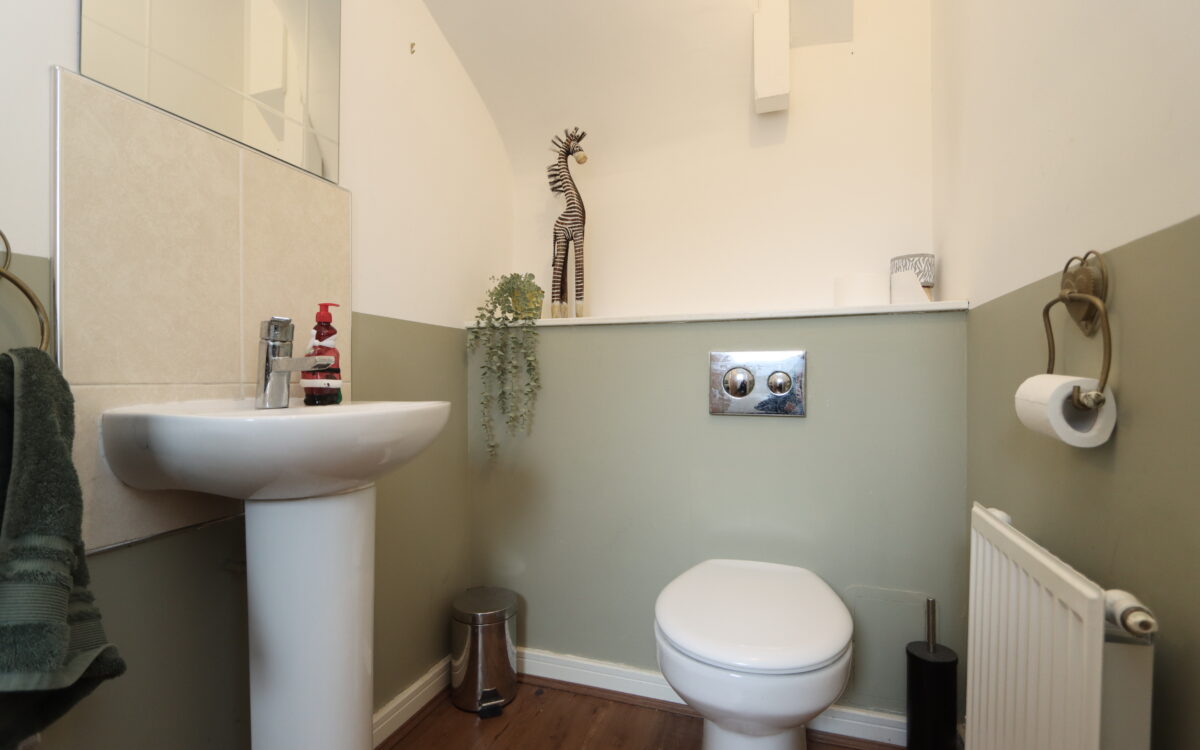 CLOAKROOM: pedestal washbasin, low level WC, extractor fan & radiator.