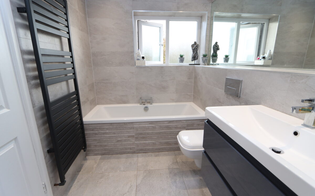 SUPERB REFITTED BATHROOM: 6’3″ X 10’6″ (1.91m x 3.20m) tiled floors & walls, panelled bath, low level WC, large shower cubicle, vanity unit, upright towel radiator, 8 concealed downlighters & uPVC double glazed window.
