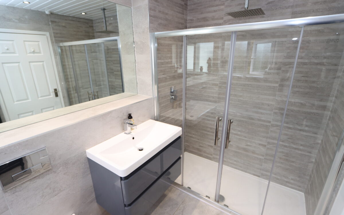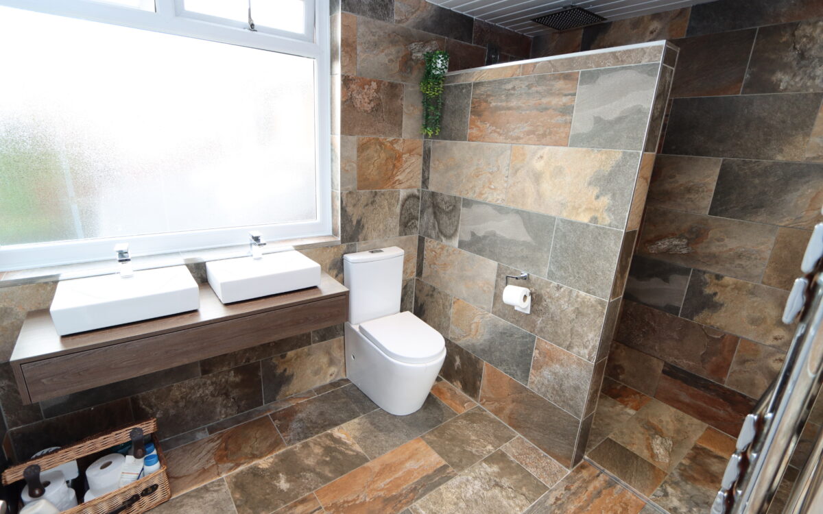 EN-SUITE SHOWER ROOM: 6’6″ x 10’0″ (1.98m x 3.05) fully tiled walls & floor, twin sinks, low level WC, large walk-in shower cubicle, upright stainless steel towel radiator, uPVC double glazed window & extractor fan.