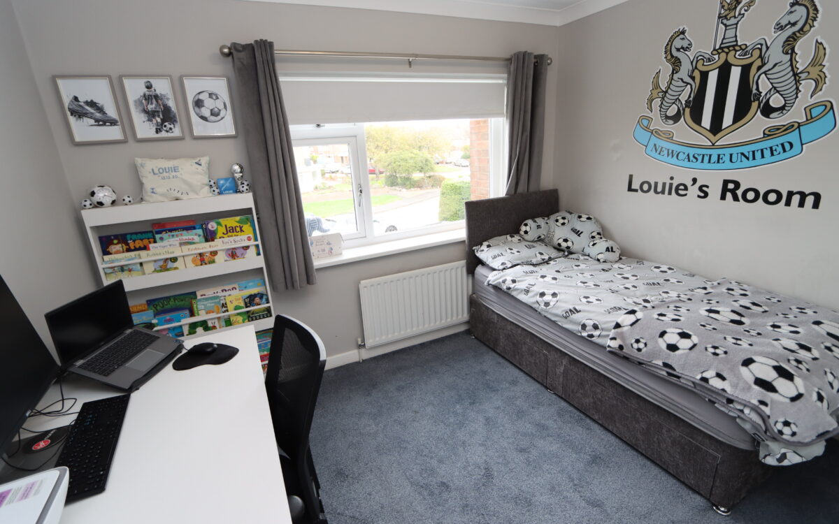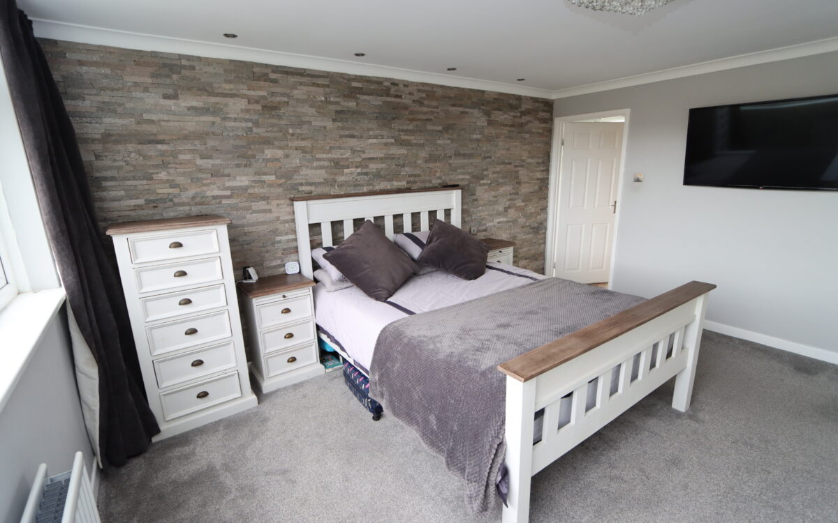 No. 1: over garage 14’8″ x 13’7″ (4.47m x 4.14m) with double radiator & uPVC double glazed window.