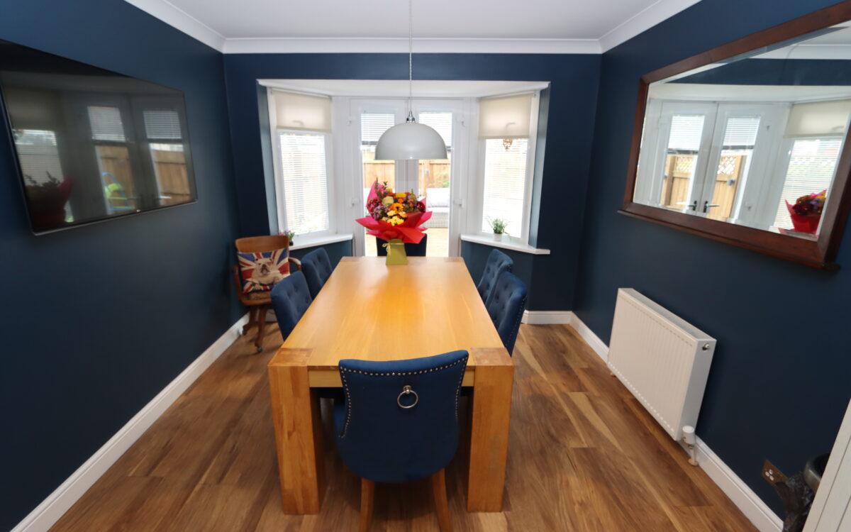 Dining area: radiator, uPVC double glazed bay window & double doors leading to garden with decked area.