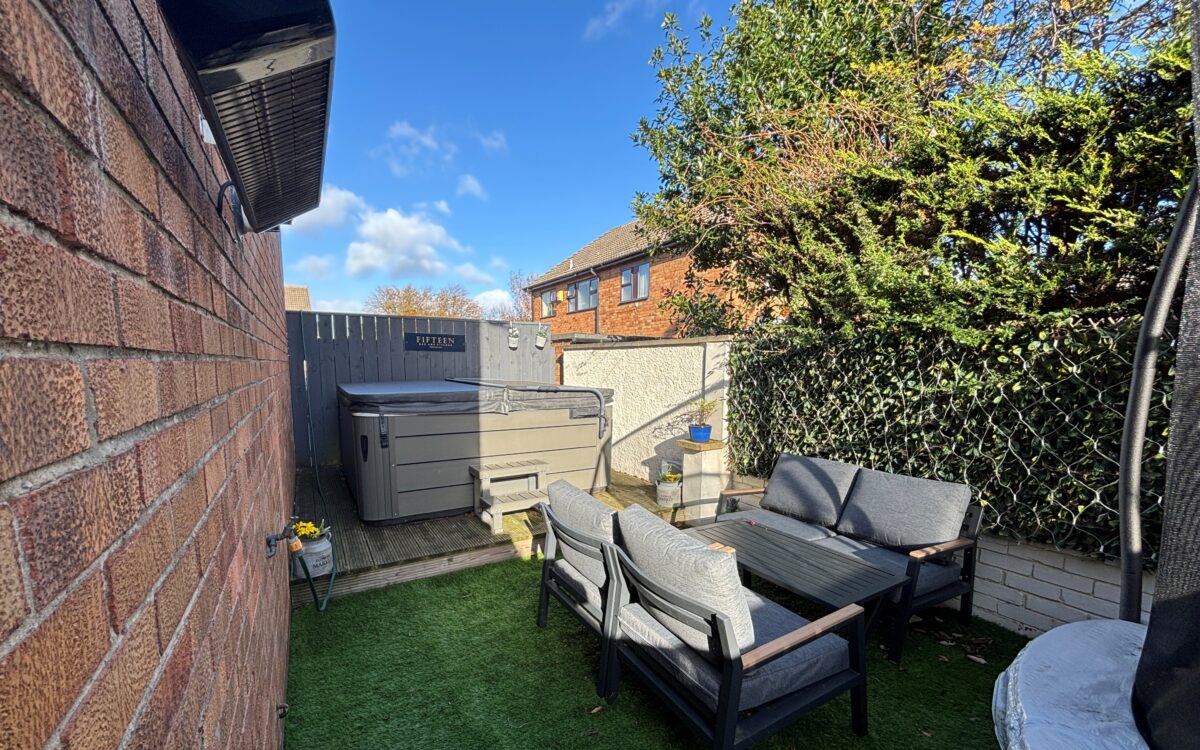 GARDENS: the front has a large drive providing standage for numerous cars, electric gates, electric car charging point, shaped lawn & borders and is well screened with decked area. The side garden is enclosed with artificial turf, raised decked area which is 10’9″ (3.28m) wide with tap for hosepipe and a sunny south aspect.