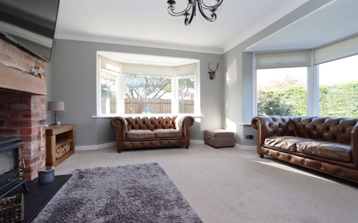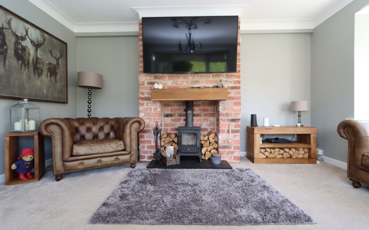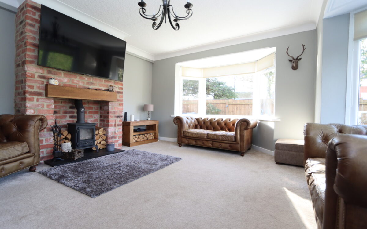 LOUNGE: 17’0″ x 16’9″ (5.18m x 5.11m) including 2 uPVC double glazed bay windows, brick feature fireplace with log burner & 2 double radiators.