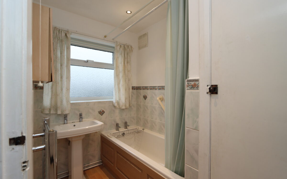 BATHROOM: panelled bath with shower over, pedestal washbasin, upright stainless steel towel radiator, partially tiled walls, airing cupboard containing ‘Worcester’ combi-boiler and uPVC double glazed window.