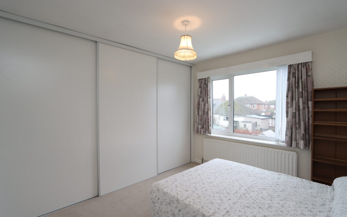 No. 2: 11’6″ x 9’11” (3.51m x 3.02m) plus fitted wardrobes all along one wall, radiator and uPVC double glazed window with vertical louvre blinds.