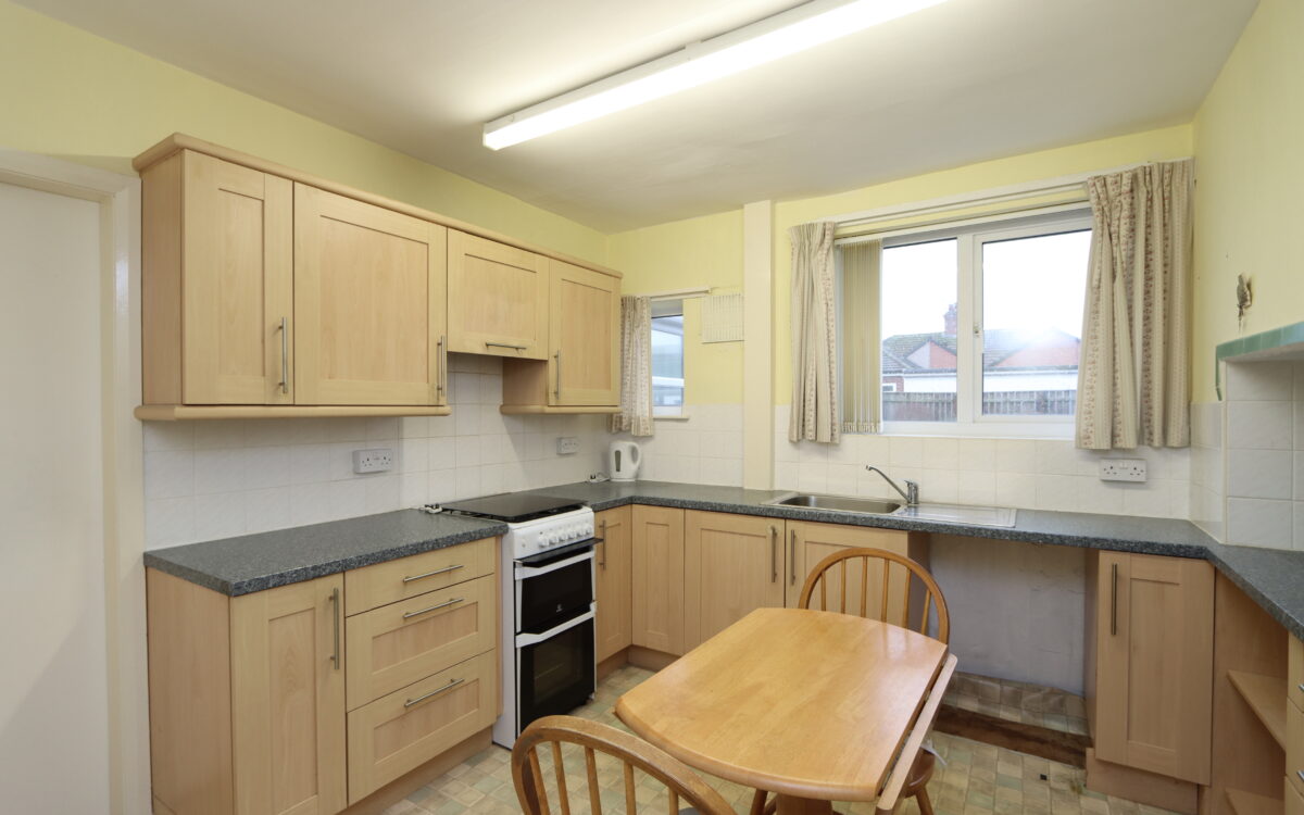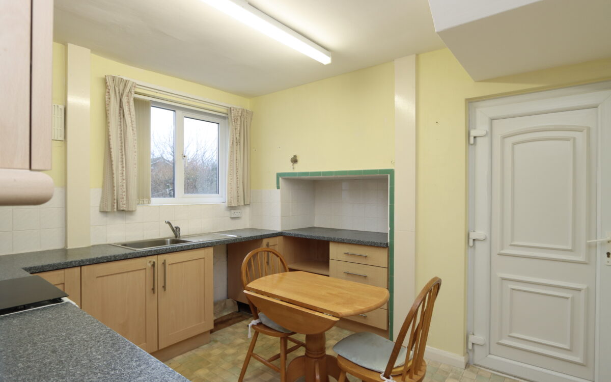 BREAKFASTING KITCHEN: 9’3″ x 11’6″ (2.82m x 3.51m) with fitted wall and floor units, stainless steel sink, partially tiled walls, radiator and 2 uPVC double glazed windows.