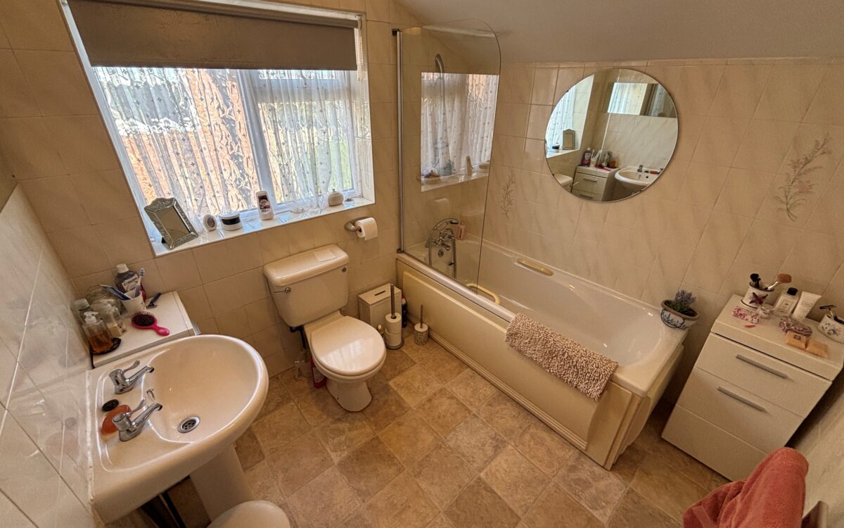 BATHROOM: 7’7″ x 7’1″ (2.31m x 2.16m max overall measurement) fully tiled walls, panelled bath with shower attachment on taps, washbasin, low level WC, radiator, heated towel radiator and uPVC double glazed window.