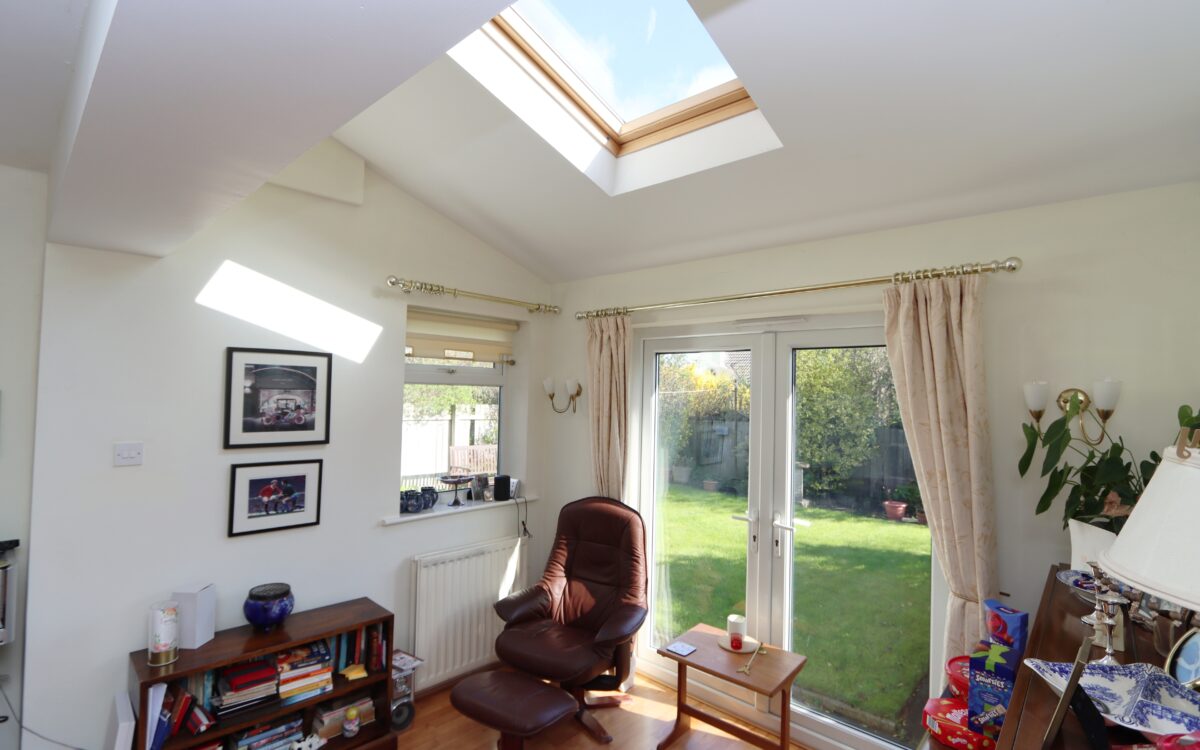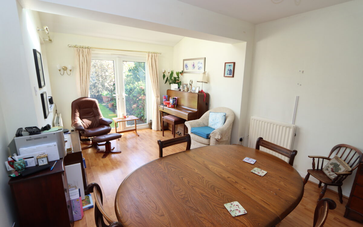 EXTENDED DINING ROOM: 16’9″ x 11’2″ (5.11m x 3.40m) part vaulted ceiling with double glazed ‘Velux’ window, uPVC double glazed window, 2 double-banked radiators and uPVC double glazed double-opening doors to rear garden.