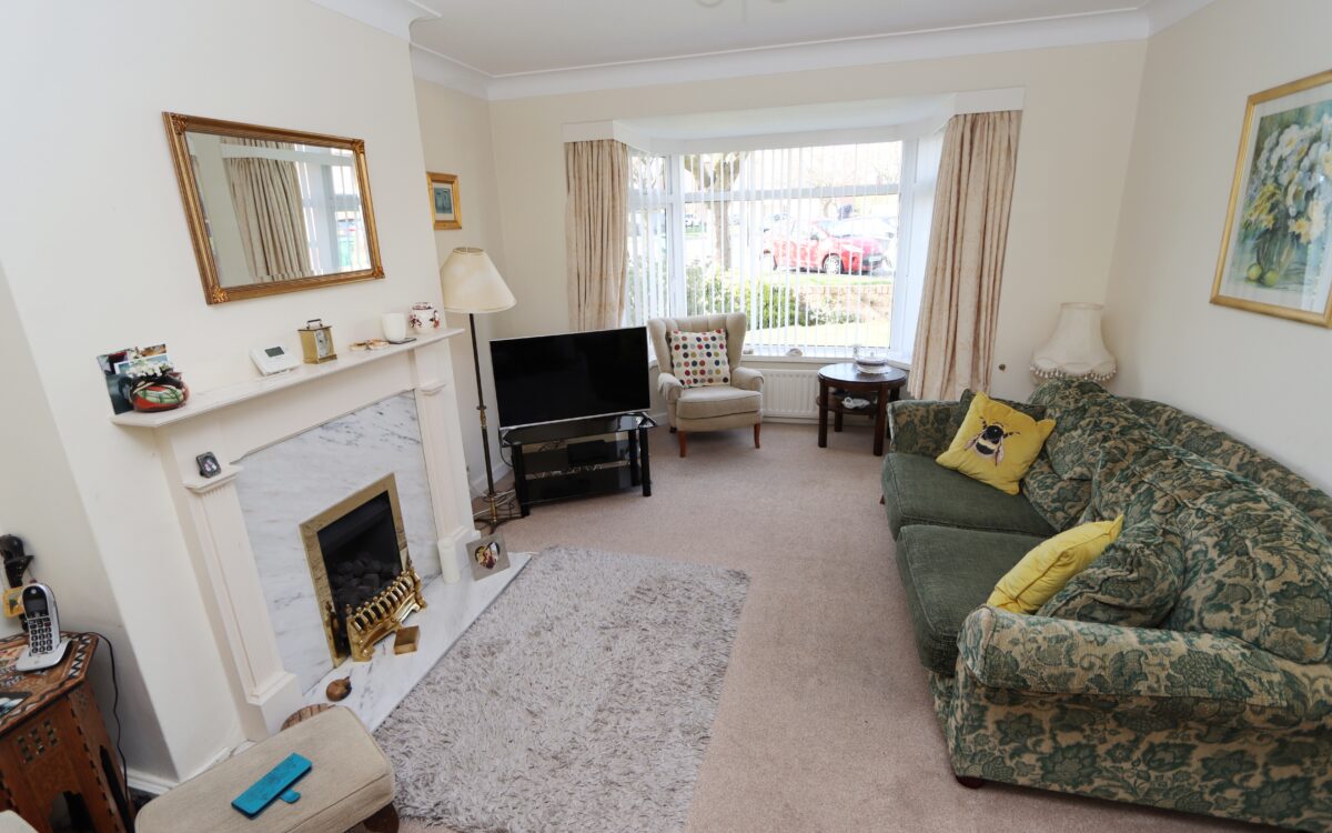 LOUNGE: 11’5″ x 17’3″ (3.48m x 5.26m) including uPVC double glazed bay window with vertical louvred blinds, fireplace with ‘living flame’ gas fire, 2 radiators and glazed sliding doors to dining room.