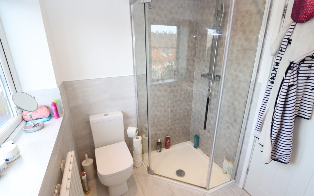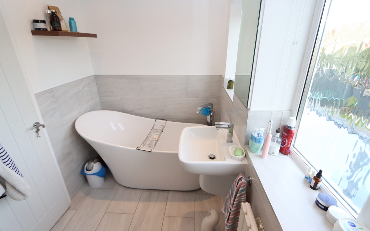 BATHROOM: tiled floor, ½ tiled walls, separate fully tiled shower cubicle, 4 concealed down lighters, low level WC, towel radiator, 2 uPVC double glazed windows, wall mounted washbasin with mixer tap and freestanding ‘slipper’ bath with contemporary mixer tap.