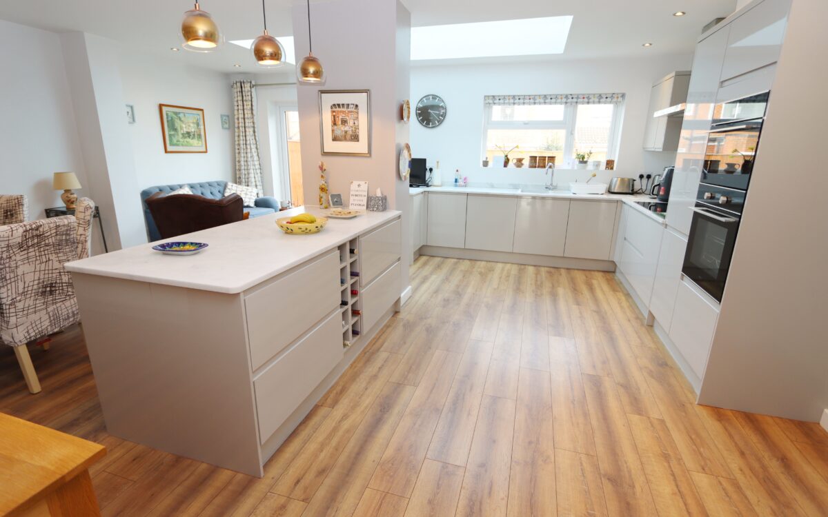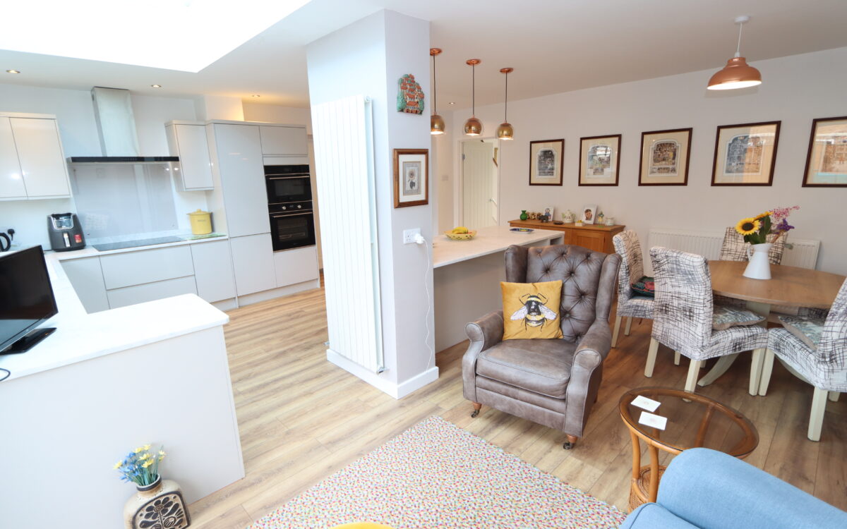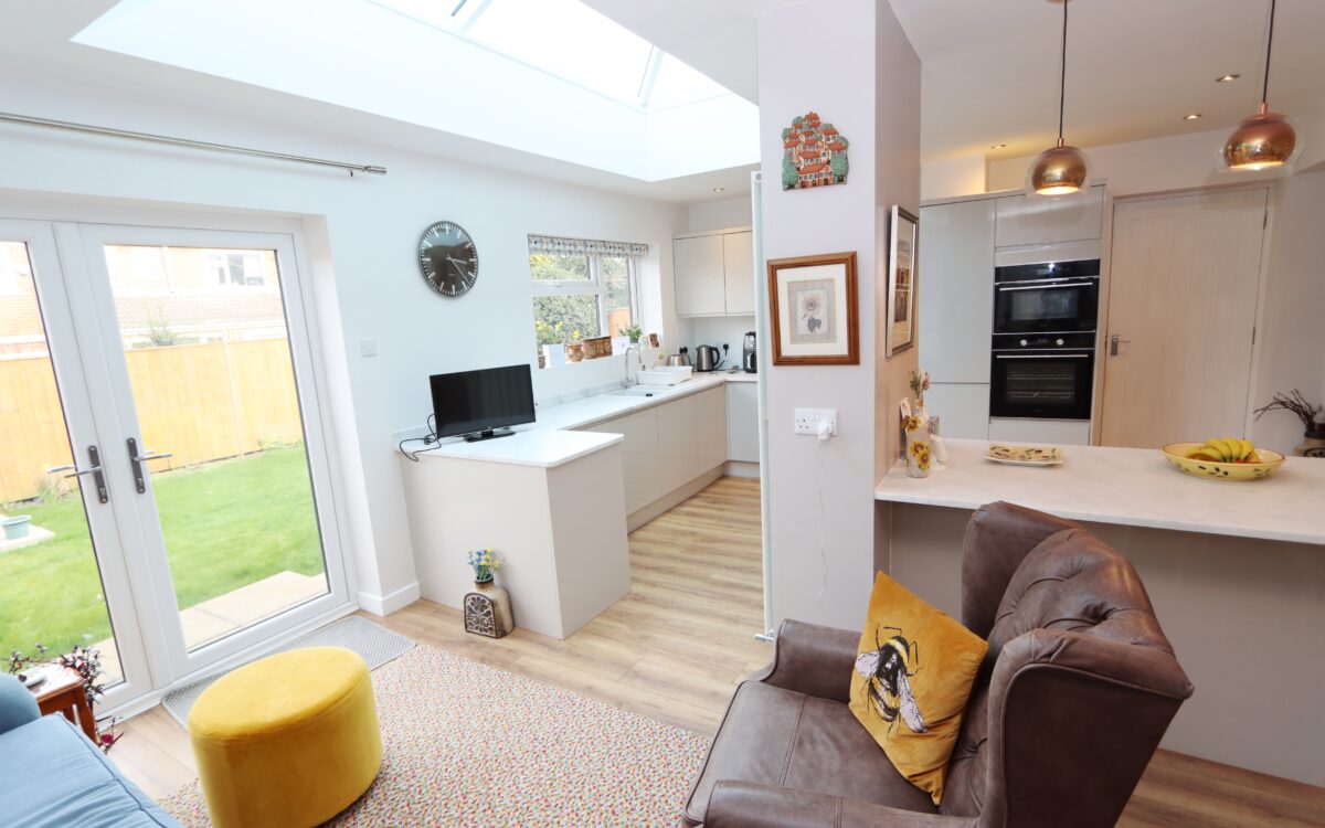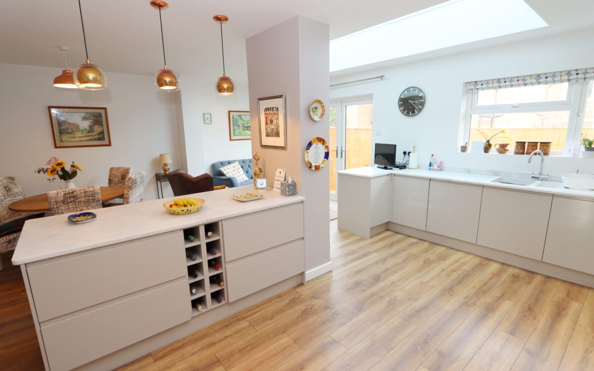 DINING KITCHEN / FAMILY ROOM: 20’ 2” x 18’ 5” (6.15m x 5.61m) refitted in 2019 with an excellent range of fitted wall & floor units including fitted wine rack and integrated bin solution in hi-gloss with soft close doors and drawers, ‘Caple’ oven, ‘Caple’ combi microwave, upright radiator, ‘Minerva’ work surfaces and upstands, 4 ring induction hob with illuminated extractor hood above, 1½ bowl ‘Franke’ sink with drainer & matching mixer tap, (fridge/freezer by separate negotiation) uPVC double glazed window, integrated dishwasher, uPVC double glazed double opening doors leading to rear garden, double banked radiator, aluminium double glazed roof lantern, fitted breakfast bar and 8 concealed down lighters.