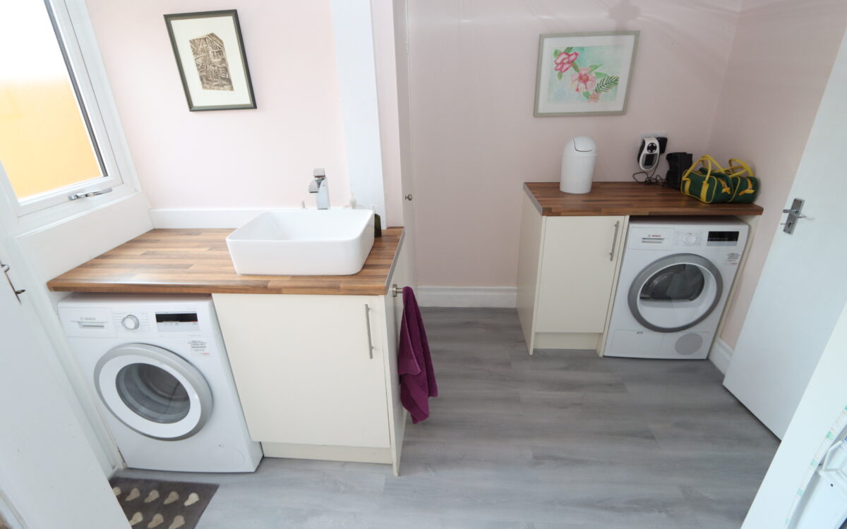 REFITTED UTILITY ROOM: 7’ 10” x 9’ 11” (2.39m x 3.02m), fitted floor cupboards, benchtop sink, plumbing for washing machine, new uPVC double glazed window, composite door to rear garden, door to garage, door to downstairs WC, light, power and PVC ceiling.